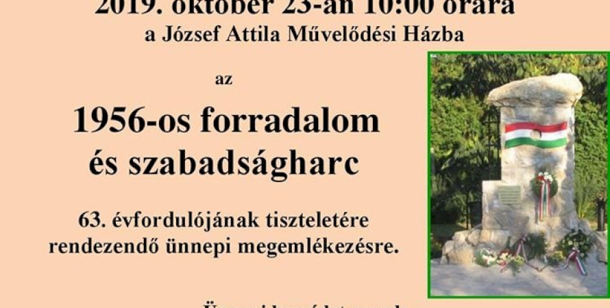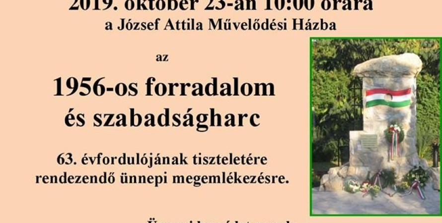 A Balatonszárszói Nagyközségi Önkormányzat tisztelettel várja az ünneplőket a József Attila Művelődési Házba az 1956 -os forradalom és szabadságharc 63. évfordulójának tiszteletére rendezendő ünnepi megemlékezésre.
