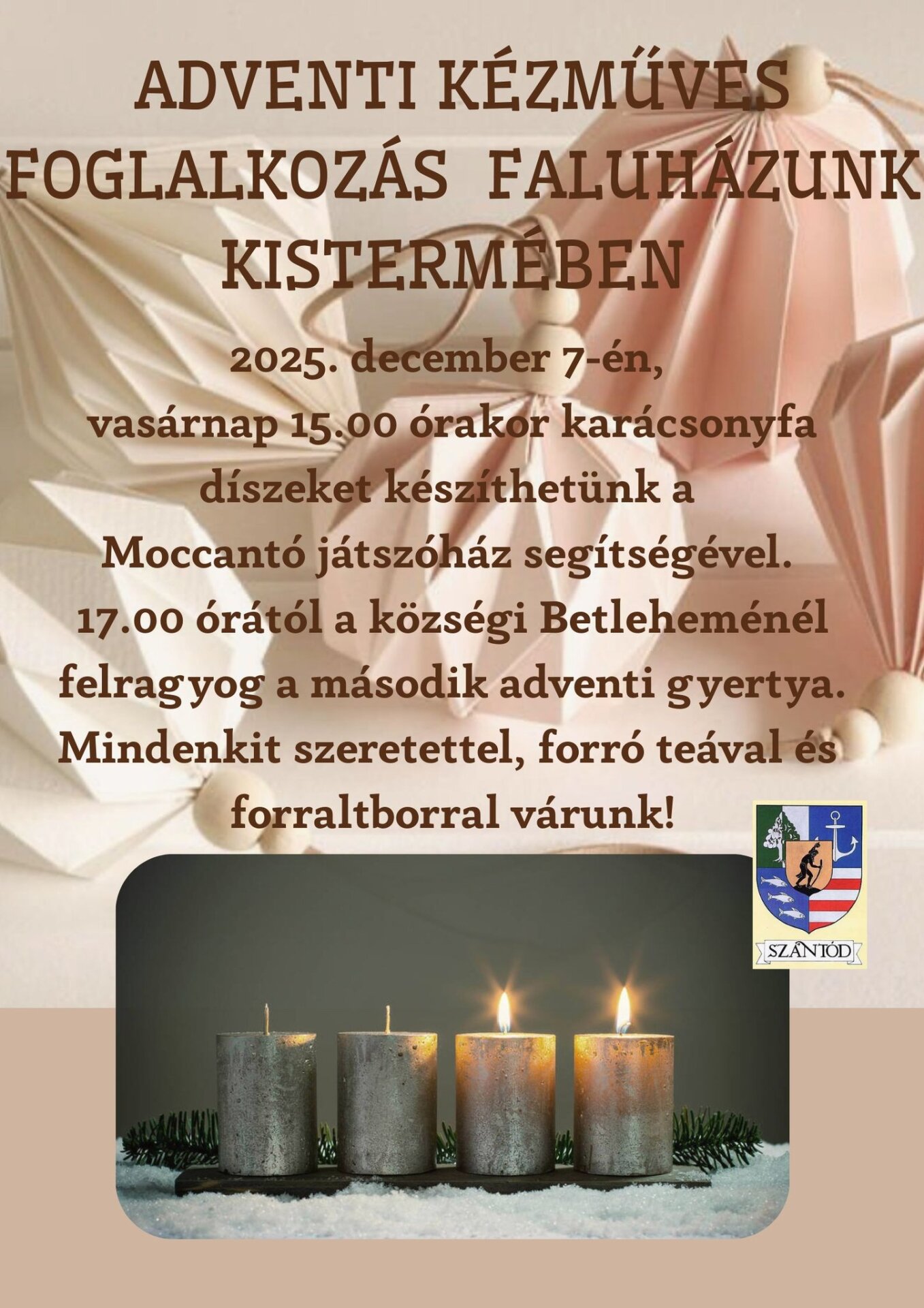 Szeretettel várnak minden kedves érdeklődőt a Pálóczi Horváth Ádám Közházban közös adventi kézműves foglalkozásra, majd utána 17:00 órától a községi Betlehemnél a második adventi gyertya meggyújtására.
