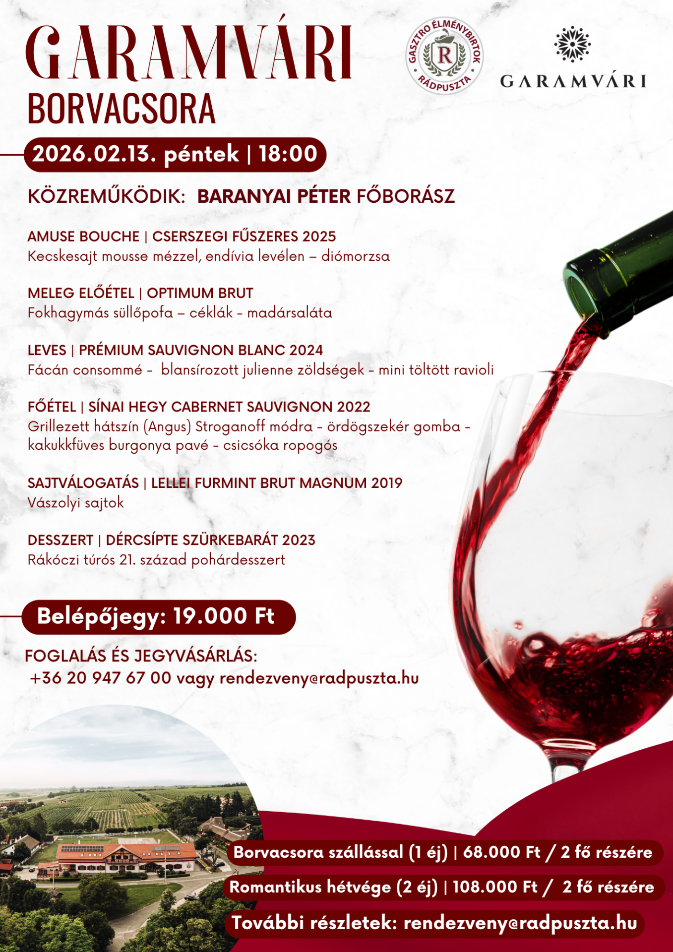 Az est során többfogásos vacsora és a Garamvári borai, pezsgői várják a vendégeket.