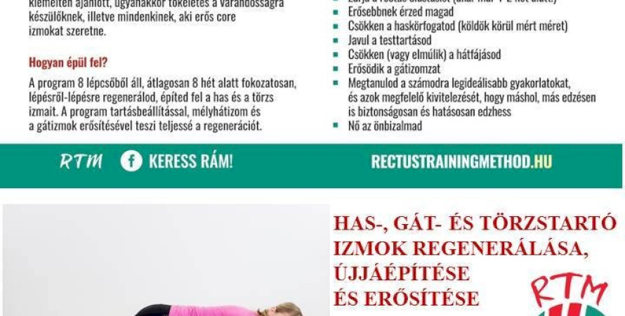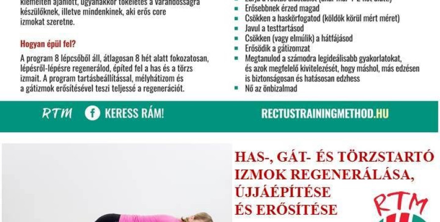 Az RTM egy komplett rehabilitációs program, ami a rectus diastasisra (egyenes hasizmok eltávolodására) fókuszál, és fel/újra építi a gyenge törzstartó izmokat. A program célja nem csak az, hogy rendbe hozza a szülés utáni pocakot, hanem hogy megtanulj ezzel együtt élni; megértsd, mi történt a testedben, és segítsen megelőzni a jövőbeni komolyabb károkat. A program várandósoknak és a szülés utáni időszakban kiemelten ajánlott, ugyanakkor tökéletes a várandósságra készülőknek, illetve mindenkinek, aki erős core izmokat szeretne.