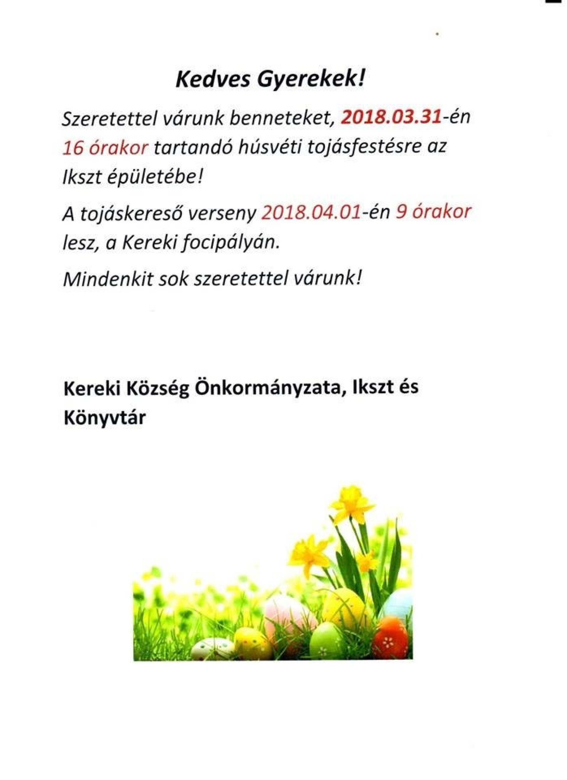 A tojáskereső verseny 2018.04.01-én 9 órakor lesz, a Kereki focipályán.