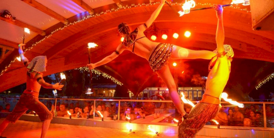 A hangulatosan kivilágított medencéknél a zenei aláfestés 19:00 órától indul, az esti műsor kezdési időpontja pedig 21:00 óra.