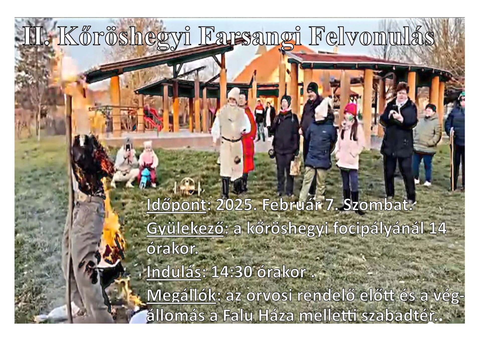 14:30 órától indul a farsangi felvonulás a kőröshegyi focipályától a faluházig.