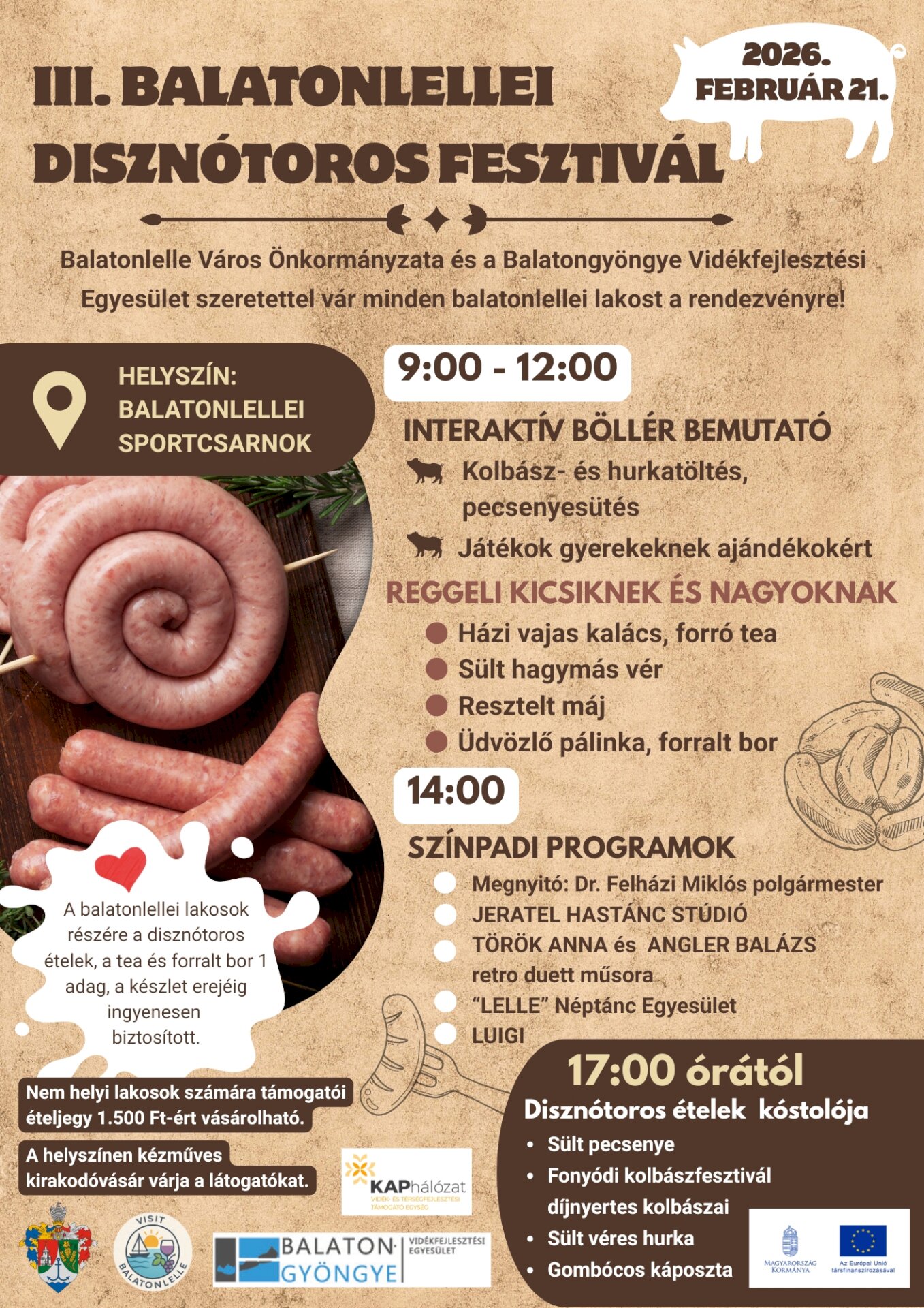 Szeretettel várjuk a balatonlellei lakosokat és minden érdeklődőt egy hamisítatlan téli disznótoros mulatságra február 21-én a balatonlellei Sportcsarnokban! 9:00-12:00: Interaktív böllér bemutató- Kolbász- és hurkatöltés, pecsenyesütés- Játékok gyerekeknek ajándékokért Reggeli kicsiknek és nagyoknak:• Házi vajas kalács, forró tea• Sült hagymás vér• Resztelt máj• Üdvözlő pálinka, forralt bor 14:00 órától: Színpadi programokKöszöntőt mond Dr. Felházi Miklós polgármester, fellép a Jeratel Hastánc Stúdió,Török Anna és Angler Balázs retro duett műsora,a „Lelle” Néptánc Egyesület és Luigi gondoskodik a hangulatról! 17:00 órától: Disznótoros ételek kóstolója• Sült pecsenye• Fonyódi kolbászfesztivál díjnyertes kolbászai• Sült véres hurka• Gombócos káposzta A balatonlellei lakosok részére a disznótoros ételek, tea és forralt bor 1 adag erejéig, a készlet erejéig ingyenesen biztosított! Nem helyi lakosok számára támogatói ételjegy vásárolható: 1.500 Ft
