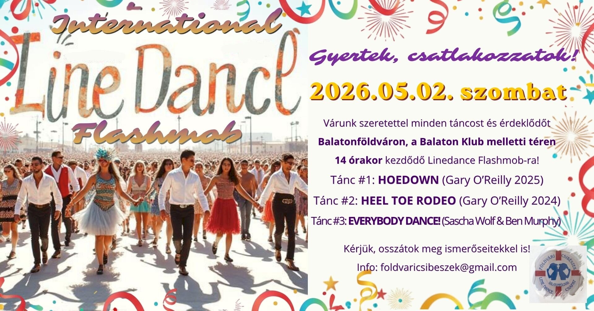 Várunk szeretettel minden táncost és érdeklődőt Balatonföldváron, a Balaton Klub melletti téren (8623 Balatonföldvár, Somogyi Béla u. 1.), a 14 órakor kezdődő Line Dance Flashmob-ra!