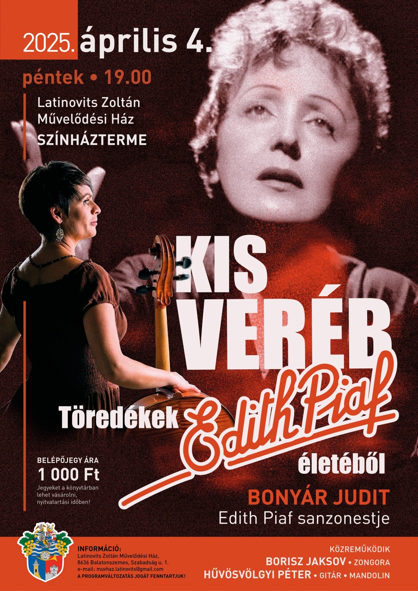 A KIS VERÉB című esten Bonyár Judit csodálatos hangja varázsolja közénk a halhatatlan művésznőt, és az ismert dalok mellett elhangoznak a Sanzonkirálynő életrajzából vett önvallomások, töredékek, melyek sanyarú gyermekkorától a haláláig mutatják be hányattatott sorsát.
