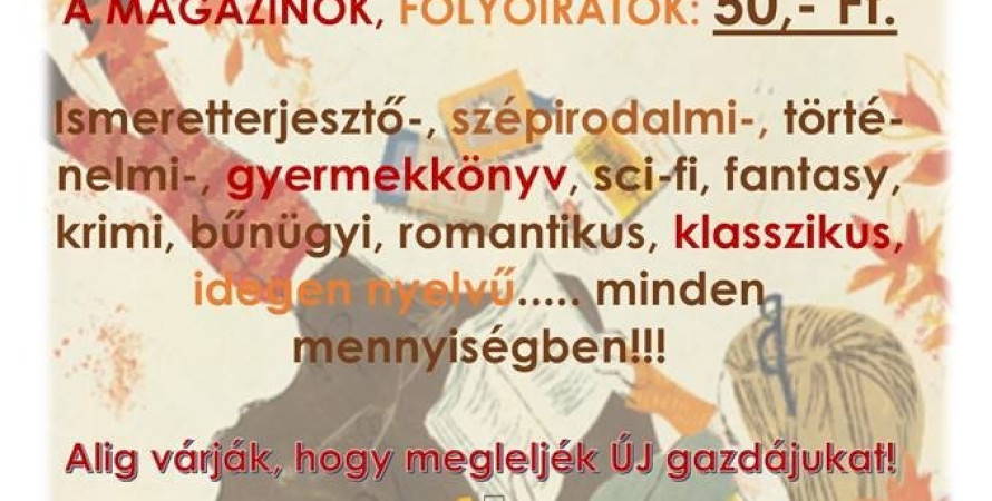 A közösségi ház emeletén és a földszinten, 200,- Ft-os egységáron!!! A MAGAZINOK, FOLYÓIRATOK: 50,- Ft.