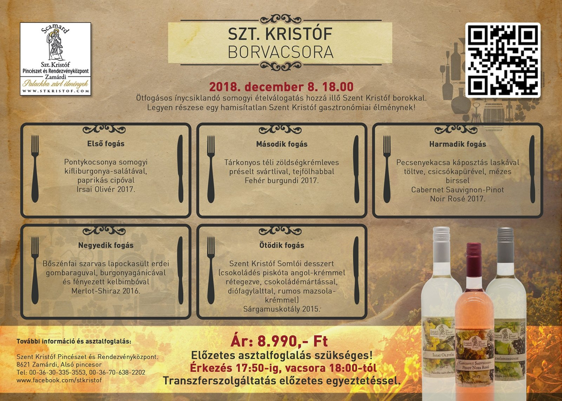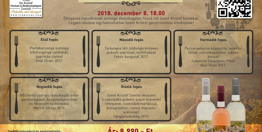 Ötfogásos ínycsiklandó somogyi ételválogatás hozzá illő Szent Kristóf borokkal.