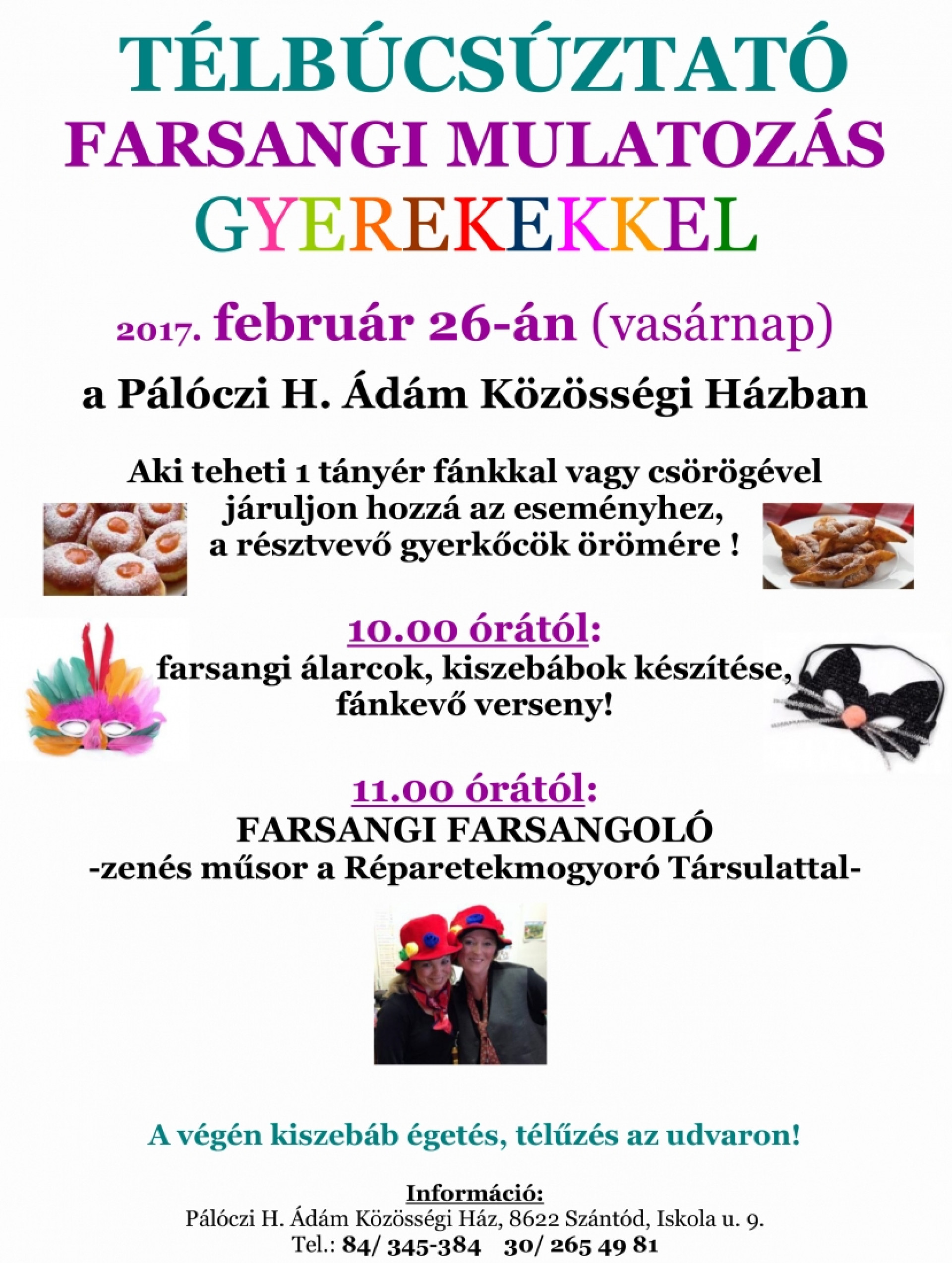 Télbúcsúztató Farsangi Mulatozás Gyerekekkel 2017. február 26-án (vasárnap) a Pálóczi H. Ádám Közösségi Házban!