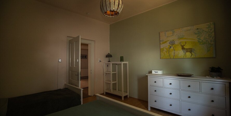 Zöld háló: 1 francia ágy (160x200), 1 egyágyas ágy (90x200) nagyobb komód, egy nyitott, akasztóspolcos tároló, ágyak mellett kiskomód asztali lámpával és konnektor