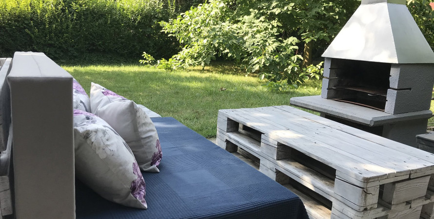 Terasz: kerti bútor, nagy állítható napernyő, kerti sütögető.